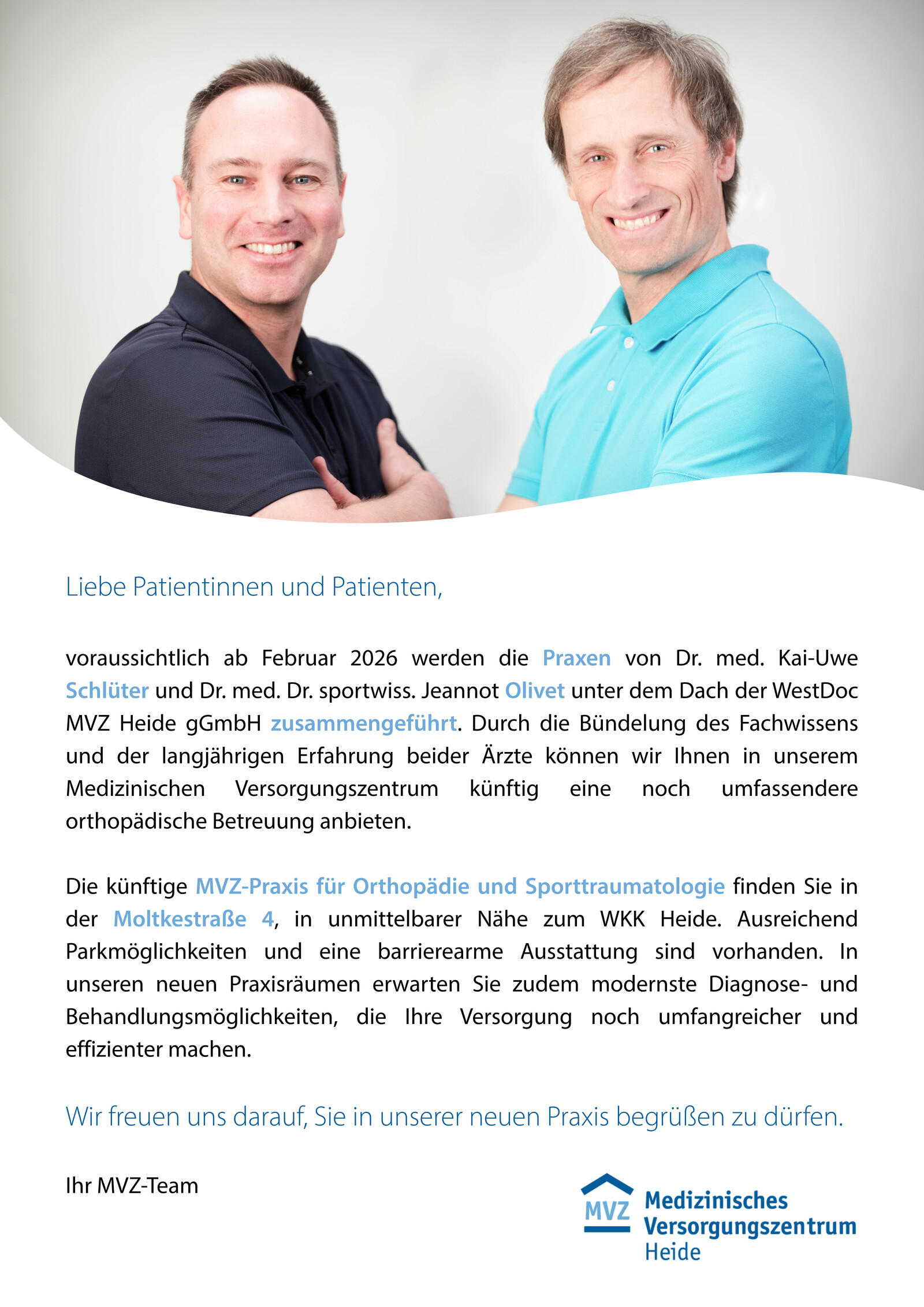 Im Fachbereich Orthopädie im WestDoc MVZ Heide bieten wir Ihnen sämtliche Möglichkeiten der modernen, orthopädischen Diagnostik und individuell abgestimmte Therapiekonzepte für den gesamten Haltungs- und Bewegungsapparat. Eine patientenorientierte Betreuung, detaillierte Aufklärung, regelmäßige Weiterbildungen, qualitätsgesicherte Organisations- und Behandlungsabläufe sowie eine optimale Kommunikation mit den zuweisenden Ärzten in Heide und Umland werden bei uns großgeschrieben.