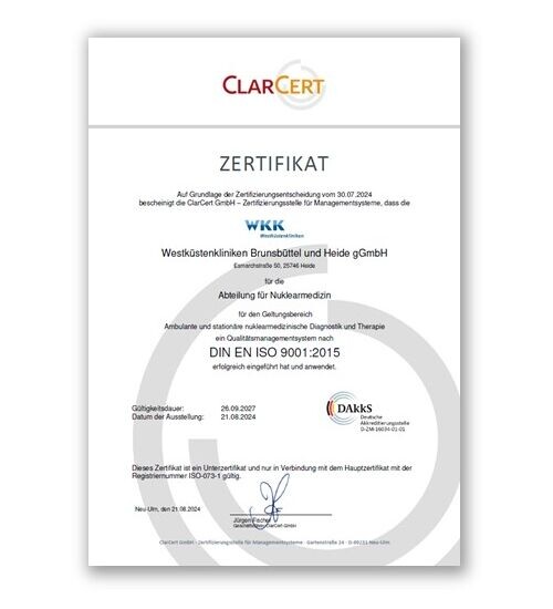 Der Schwerpunkt unseres stationären Leistungsspektrums ist die Radiojodtherapie von Schildddrüsenerkrankungen. Darüber hinaus halten wir ein breites Angebot an modernen Diagnose und Therapieverfahren bei Tumorerkrankungen, orthopädischen Problemen oder Durchblutungsstörungen des Herzens bereit. Bei den Untersuchungen arbeiten wir eng mit anderen Kliniken und Zentren innerhalb der Westküstenkliniken zusammen.