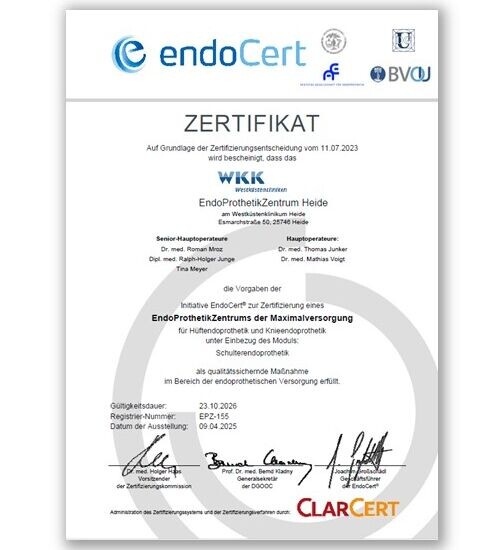 Gemäß den Kriterien eines Endoprothetik-Zentrums müssen alle geplanten endoprothetischen Eingriffe durch eine/n Hauptoperateur*in bzw. mit dessen Assistenz durchgeführt werden. Diese Hauptoperateur*innen müssen mindestens 2 Jahre hintereinander mehr als 100 endoprothetische Eingriffe durchgeführt haben. Am WKK in Heide kann diese Versorgungsqualität garantiert werden. Wir sind daher als EPZmax zertifiziert.