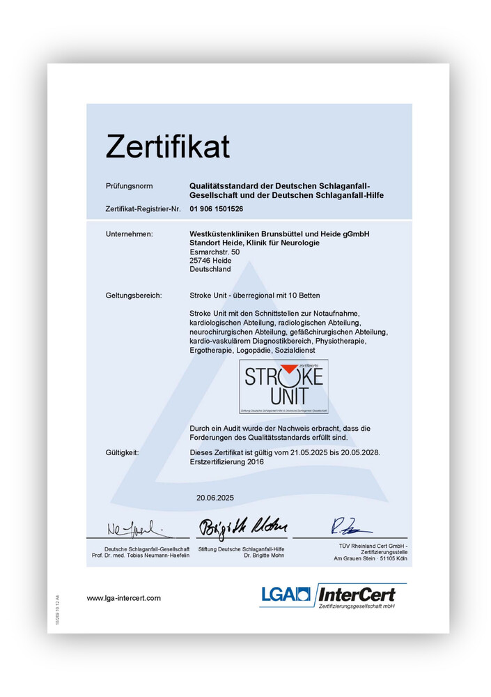 Hier arbeiten die Spezialisten aus der Neurologie und Neurochirurgie, der Radiologie (mit Neuroradiologie) sowie der Klinik für Frührehabilitation und Geriatrie bei der Diagnostik und Therapie eines Schlaganfalls Hand in Hand zusammen. Um ein reibungsloses Zusammenspiel zu gewährleisten, sind die Prozesse standardisiert und die Versorgung in der Stroke Unit in Heide von der Deutschen Schlaganfallgesellschaft zertifiziert.