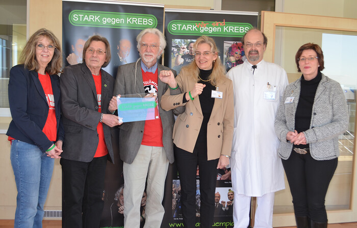 Spendenübergabe auf der Palliativstation (v. links): Susanne Rusch und Hans-Erich Sievers, Mitglieder des Wattrates, Jens Rusch, Künstler, Mitglied des Wattrates und Initiator der Aktion „Stark gegen Krebs“, sowie WKK-Geschäftsführerin Dr. Anke Lasserre, Prof. Dr. Fritz S. Keck, Chefarzt der Medizinischen Klinik 1 und Susanne Bahnsen-Friedrichs, Stationsleitung der Palliativstation. (Foto: WKK/Bornholt)