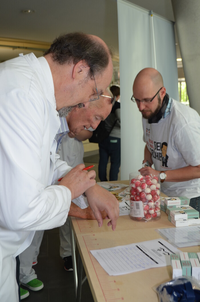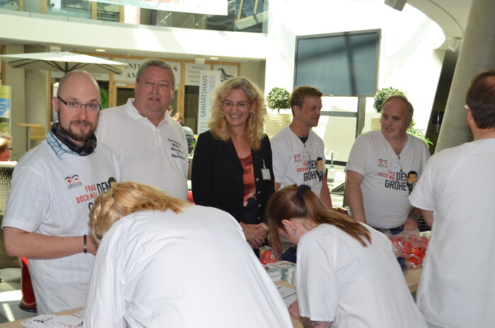 Heide, 29.06.2015. Mit einem Informationstag beteiligte sich das Westküstenklinikum Heide an der landesweiten Aktion „Frag doch mal den Gröhe“, um auf die schwierige wirtschaftliche Lage der schleswig-holsteinischen Krankenhäuser aufmerksam zu machen. Gemeinsam stellten sich Geschäftsführung und Betriebsrat am Montag den Fragen der Patienten, Mitarbeiter und der Bevölkerung im Eingangsbereich des Westküstenklinikums Heide.