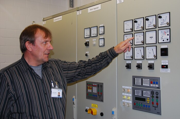 An den Anzeigen einer Schalttafel kontrolliert Karsten Dethlefs die Notstromanlage des Westküstenklinikums Heide. (Foto: WKK/Kienitz)