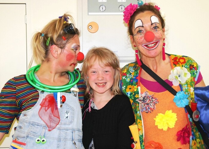 Nele freut sich über den Besuch der beiden Klinikclowns Wu (li.) und Flora.