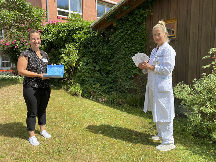 Ines Röpstorff und Dr. Meike Reh präsentieren die Eliboxen und die Taschenkarten Demenz-Delir