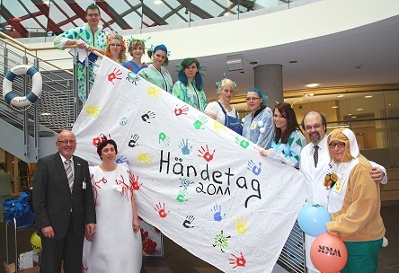 Heide - Fantasievoll verkleidet als Noroviren, Kolibakterien oder Schweinegrippenviren haben Heider Pflegeschülerinnen und -schüler auf die Bedeutung der Händedesinfektion hingewiesen. Im Rahmen des Händetages 2011 überraschten sie die Mitarbeiter des Westküstenklinikums, um zu sehen, wie gut sie ihre Hände desinfizieren. Bestückt mit UV-Lampen, Wagen voller Desinfektionsmittel und Handabklatsch-Präparationsschalen wurden Pflegestationen und weitere medizinisch relevanten Bereiche aufgesucht.