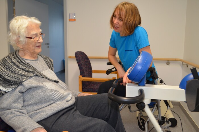 „Die neuen Zimmer gefallen mir sehr gut. Auch der Umzug von der alten Station hierher hat hervorragend geklappt“, lobt die Seniorin und fügt noch hinzu, dass sie auch ganz generell mit dem Ablauf ihrer Behandlung im Haus zufrieden ist. „Die Organisation stimmt“, sagt Edith Sobotke und tritt sodann angeleitet von Physiotherapeutin Stefanie Leiste in die Pedale eines Hometrainers.