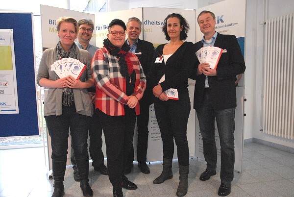 Mitglieder MRE-Netzwerkes Dithmarschen präsentieren Infoblätter (von links): Christina Walther (Hygenefachkraft des WWK), Hygenekontrolleur Kai Steinhäuser, Vorsitzende Milica Djuric-Wucherpfenning, Klaus-Peter Tiessen (Leiter des Fachdienstes Gesundheit, Betreuung und Projektplanung), Anja Diekmann-Keden (Hygenefachkraft des WWK) und Gesundheitsingenieur Harry Schraven. Foto: Kreis Dithmarschen