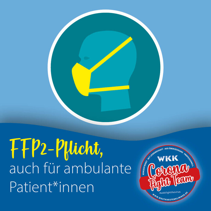 Ambulante Patient*innen müssen ab sofort beim Betreten der Westküstenkliniken und ihrer Medizinische Versorgungszentren durchgängig eine FFP2-Maske tragen und sind aufgefordert, vor einem Termin sich auf das Coronavirus testen zu lassen.