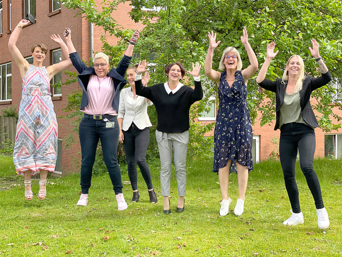 Großer Jubel über die gelungene Premiere: Die Teilnehmerinnen des ersten Kurses für die Fachweiterbildung in der Intensivpflege an den Westküstenkliniken freuen sich gemeinsam mit der Leiterin des Weiterbildungsangebots, Antje Schmidt (2.v.l.), über die bestandene Prüfung.