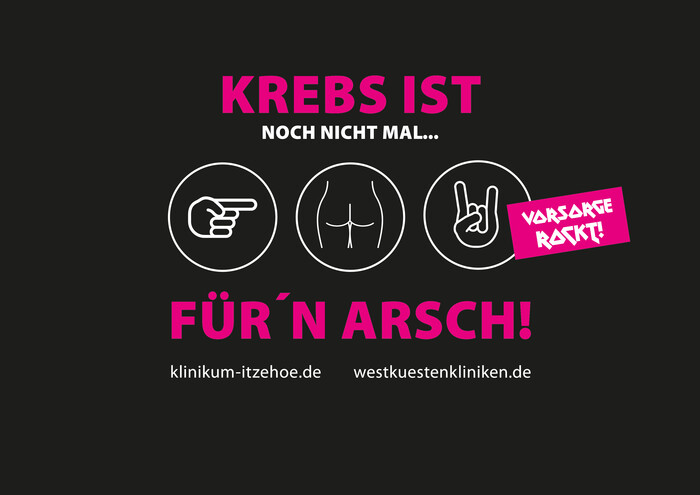 Mit dem provokanten Slogan „Krebs ist noch nicht mal für’n Arsch – Vorsorge rockt“ werben das Klinikum Itzehoe und die Westküstenkliniken gemeinsam auf dem Wacken Open Air für Darmkrebsvorsorge.