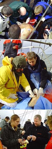 Aus medizinischer Sicht ist die Wasserrettung eine besondere Herausforderung, die in der Notarztausbildung nicht ausreichend berücksichtigt wird. Um den Umgang mit Wasserunfällen durch Fachwissen zu erweitern aber insbesondere auch durch eigene Erfahrung zu üben, konnten die Notärzte aus ganz Deutschland unter erschwerten Bedingungen bei Regen und Windstärke 6 auf der Nordsee vor Wilhelmshaven üben: neue Hilfsmittel in der Seenotrettung am Modell Emma, Wundversorgung mit Nadel und Faden auf schwankenden Planken, lebensrettende Zugänge an frisch gekühlten Schweinehälften, außerdem Vorträge zur Bekämpfung von Seekrankheit, Herz-Lungen-Wiederbelebung und neuen Beatmungstechniken (SARRRAH). Abgerundet wurde das Arbeitsprogramm durch praktische Einweisungen in das beengte Bordleben der Stammcrew sowie durch ein "Mann-über-Bord-Manöver" mit Unterstützung des DGzRS-Schiffs "Hannes Glogner".