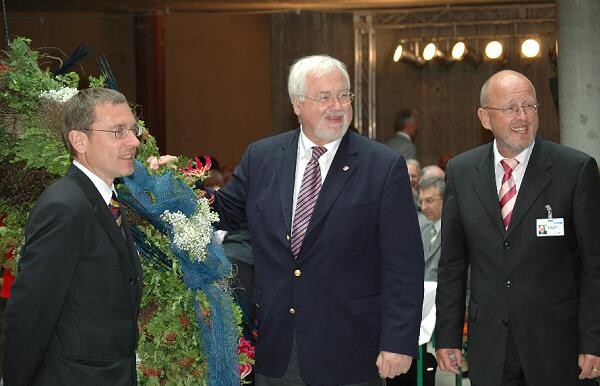Dithmarschens Landrat Dr. Jörn Klimant (li.), Ministerpräsident Peter Harry Carstensen (Mi.) und WKK-Geschäftsführer Harald Stender an der Richtkrone.