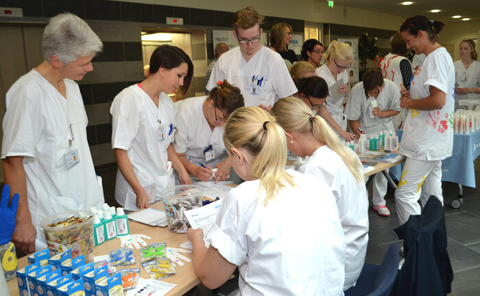 Mit einem Quiz, bunten Luftballons, zahlreichen Informationen und hilfreichen Tipps zum Thema Händehygiene fand im Westküstenklinikum Heide (WKK) der jährliche Aktionstag Saubere Hände statt. Saubere Hände sind schon im Alltag wichtig, im Krankenhaus können sie sogar überlebenswichtig sein. Denn: Bakterien lauern überall und fühlen sich besonders auf den menschlichen Händen pudelwohl, gehen sozusagen von Hand zu Hand. Dabei genügen bereits 30 Sekunden Einwirkzeit und zwei Hübe Desinfektionsmittel, die gründlich zwischen den Fingern, den Handflächen und dem Handrücken verrieben werden, um Sicherheit vor Keimen herzustellen.