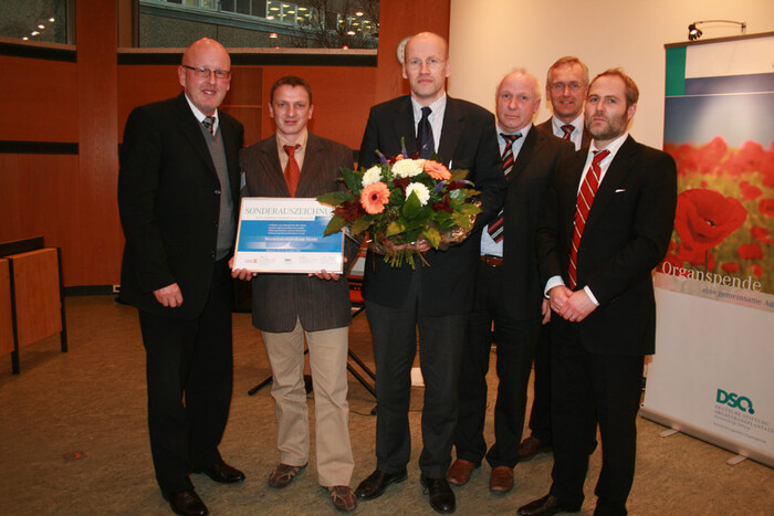 Heide/Hannover, 06.12.2010 - Das Westküstenklinikum ist mit einem Sonderpreis der Deutschen Stiftung Organtransplantation (DSO) ausgezeichnet worden. Damit würdigte die Organisation den gewissenhaften und nachhaltigen Einsatz des WKK-Teams im Sinne der Verstorbenen und der potentiellen Organempfänger. Im Rahmen einer Feierstunde nahmen WKK-Geschäftsführer Harald Stender, Priv. Doz. Dr. Tilman von Spiegel, Chefarzt der Klinik für Anästhesie und Intensivmedizin, sowie Ralf Theis, Transplantationsbeauftragter des Pflegebereichs, den Preis entgegen.