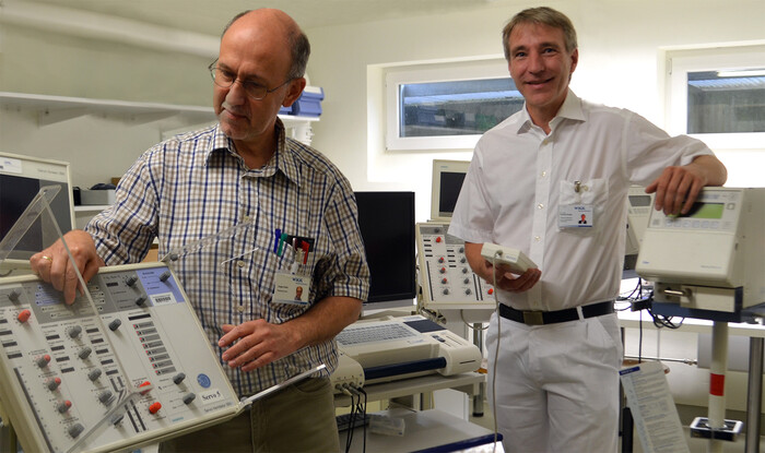 Für den Transport: Jürgen Köhn (li.) aus der Medizintechnik prüft das Beatmungsgerät für Erwachsene. Dr. Karsten Kraatz, leitender Oberarzt der Klinik für interdisziplinäre Notfallmedizin, testet noch einmal die Funktion des Beatmungsgerätes für Neugeborene. (Foto: WKK/Bornholt)