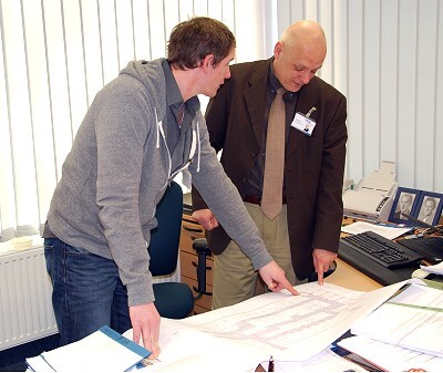 Die Entwürfe sind fast fertig und die Ausschreibungen können bald beginnen: Dipl.-Ing. Thies Brehmer (li.) erläutert dem kaufmännischen Leiter des WKK Brunsbüttel, Axel Schultz, den Stand der Planungen. (Fotos: WKK/Kienitz)
