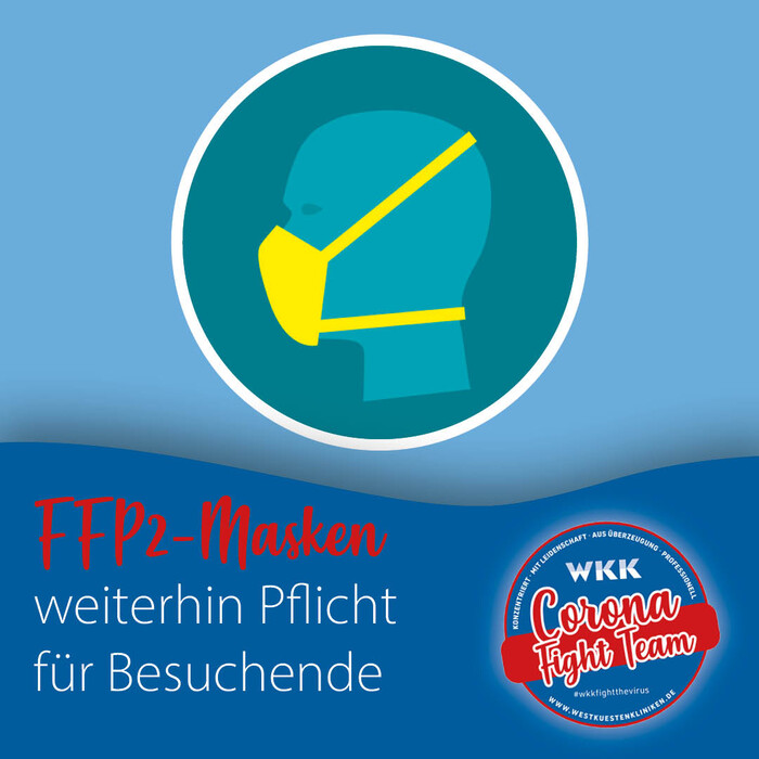 Die Westküstenkliniken behalten die Pflicht zum Tragen einer FFP-2-Maske auch nach dem 23. Juli bei. Demnach müssen auch künftig alle Besuchenden der Kliniken und ihrer Einrichtungen weiterhin durchgängig eine FFP-2-Maske tragen. Auch an der Pflicht zur Testung ändert sich für die Besuchenden nichts.
