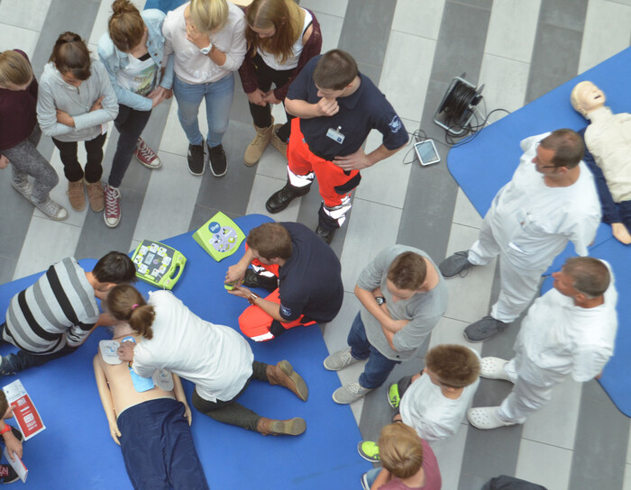 „Etwa 17 Prozent der Menschen in Deutschland wissen, was bei einem Herz-Kreislauf-Stillstand zu tun ist. Unser Ziel ist es, diese Zahl noch zu steigern und laden daher Mitarbeiter, Patienten, Besucher und Interessierte ein, an speziellen Übungspuppen den Ablauf einer Wiederbelebung zu trainieren“, erzählt der Oberarzt der Klinik für Anästhesie, Dr. Thomas Zugck und ergänzt: „Auch wer schon einmal einen entsprechenden Kursus gemacht hat, ist herzlich willkommen. Denn Wiederbelebung sollte man immer wieder trainieren – auch weil es immer wieder neue Erkenntnisse gibt.“