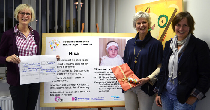 Der Bunte Kreis Nord unterstützt Eltern chronisch kranker und schwerstkranker Kinder nach dem Aufenthalt im Krankenhaus. Die Einrichtung kümmert sich auch um die sozialmedizinische Nachsorge von Früh- und Risikogeborenen, die mit schweren Krankheiten zur Welt gekommen sind. „Für die Eltern ist es eine große Herausforderung, wenn sie mit ihrem Frühgeborenen oder ihrem schwerkranken Kind, teilweise noch mit medizinischen Geräten, nach Hause kommen“, erklärt Heike Meyn. „In dieser Situation sind wir dann vor Ort und geben den Eltern Hilfestellung“, so Meyn weiter.