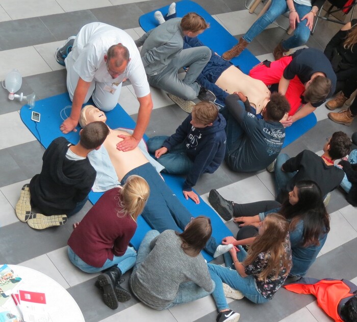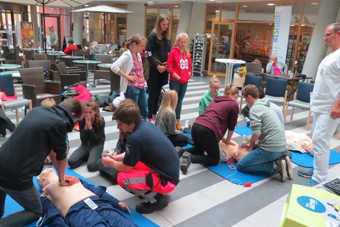 Große Action am 20. und 21.09. im Foyer des WKK: unser Beitrag zur nationalen Woche der Wiederbelebung. Neben Patienten, Passanten und Mitarbeitern aus allen Bereichen der Klinik waren auch drei Schulklassen über den Tag verteilt eingeladen, um mit Melina Stührk und ihren Azubis von der RKiSH sowie WKK-Oberarzt Dr. Thomas Oliver Zugck Wiederbelebungsmaßnahmen zu üben. Dazu waren Patientensimulatoren bereitgestellt, an denen in Kleingruppen unter Anleitung von Fachpfleger Florian Wartenberg die Herzdruckmassage sowie einfache Handgriffe der ersten Hilfe ausprobiert und geübt werden konnten.
