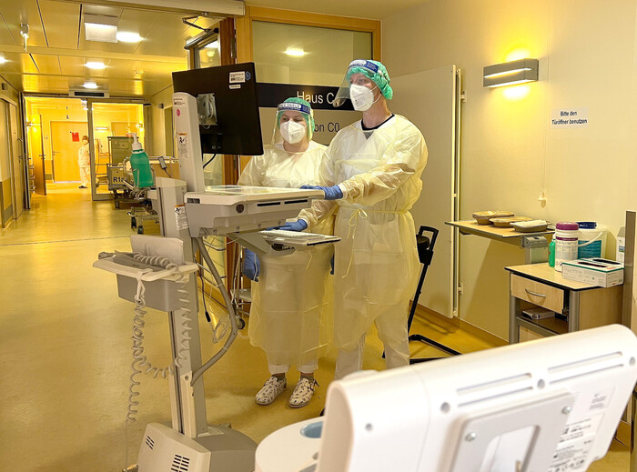 „Gemäß unserem Stufenkonzept haben wir auf einer weiteren Station zusätzliche Infektionsbetten geschaffen, um die Patient*innen möglichst zentral versorgen zu können“, so Dr. Blümke, der von einer erheblichen Belastung für die Mitarbeitenden in den Corona-Bereichen spricht und von einem hohen hygienischen und logistischen Aufwand. Denn obwohl die Patient*innen in der Regel dank der hohen Impfquote nicht mehr so schwer erkranken, stellt die Arbeit in voller Schutzkleidung und der Betreuungsaufwand durch das hohe Alter der Patient*innen für die Mitarbeitenden eine große körperliche Anstrengung dar.